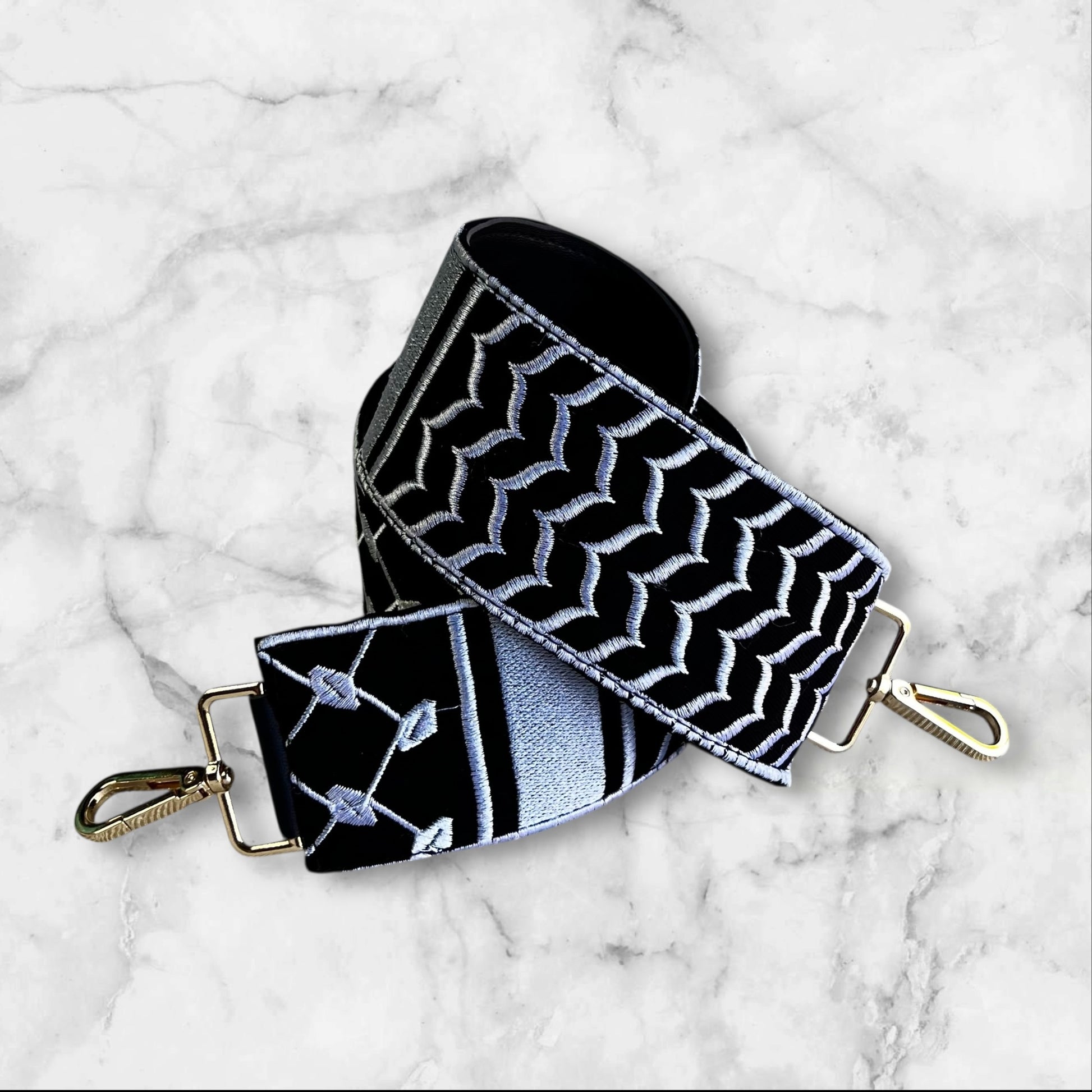 These purse straps feature traditional Palestinian tatreez embroidery. Each strap includes metal clips for easy attachment to most bags. Made with durable fabric for regular use.